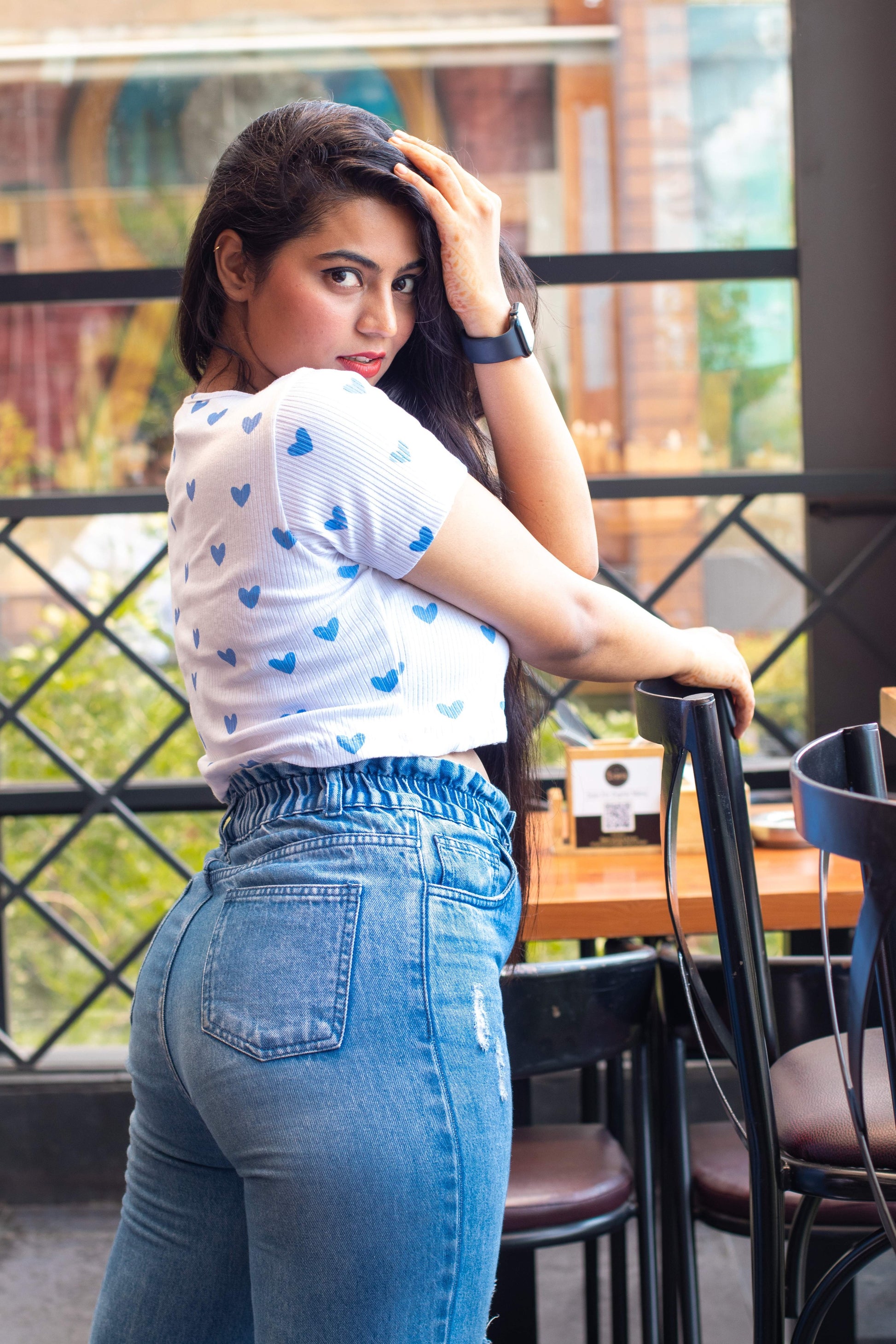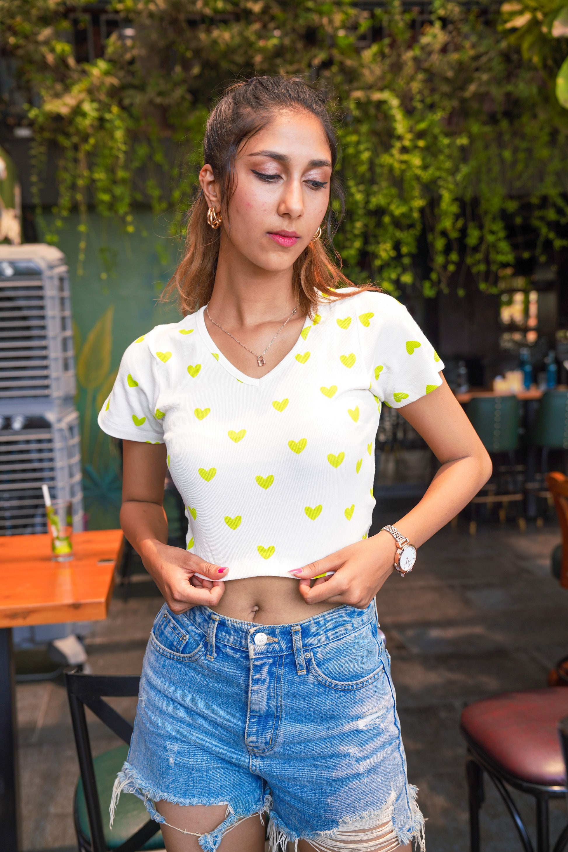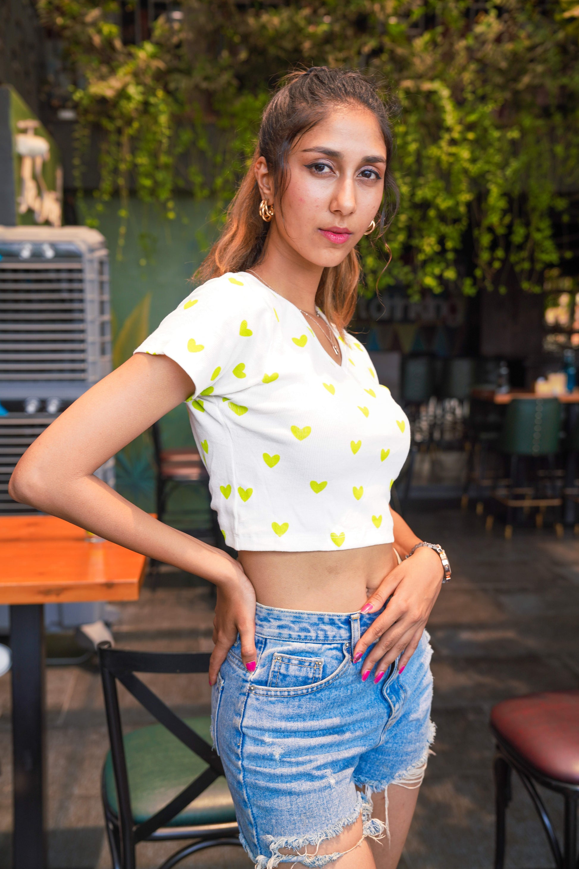 Style Pairing: For a playful and stylish look, pair your Heart Print Crop Top with high-waisted jeans, shorts, or a skirt. Consider styling it with denim cutoffs and sneakers for a casual and cute summer look. To dress it up, pair it with a high-waisted skirt and heels for a date night or a fun event. Accessorize with delicate jewelry and a crossbody bag to complete the ensemble. The Heart Print Crop Top offers versatility and endless styling possibilities for various occasions.